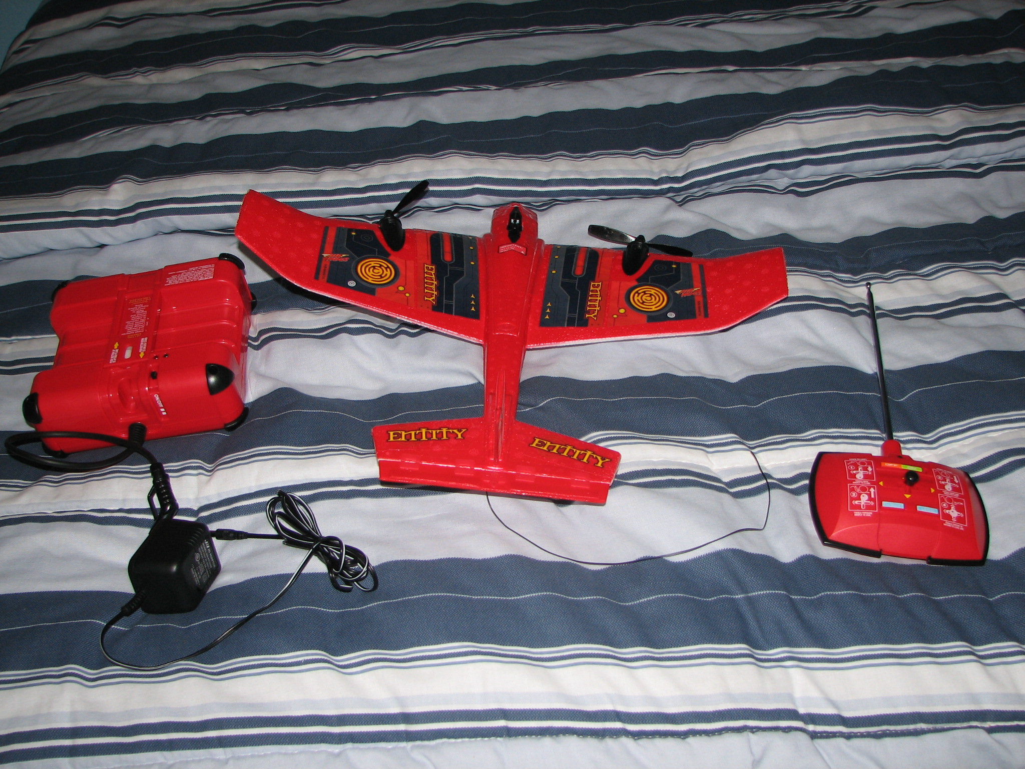 Hey Hey! I got a good “after Christmas” deal from Target: an RC airplane for $35 (the original price is $50). The issue is that the airplane charger base needs 8 D-size batteries. To save buying 8 D-size batteries, I tried to connect a 12V 500mA AC-DC transformer to the positive and negative metal contacts. It worked! Pretty amazing.