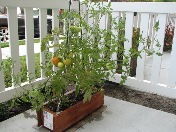 In April, I bought two tomato plants from OSH and planted them in a 15-gallon planter box. One plant is “Jetsetter”, and the other one is “Yellow Pear”. As today, the jetsetter tomato plant has about 10 small tomatoes, while the yellow pear tomato plant starts to bloom. Hopefully, I will get my first mature jetsetter tomato next week, and more jetsetter and yellow pear tomatoes in a few weeks. 🙂